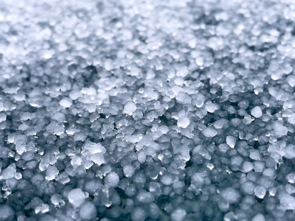 Ice pellets hit the ground as small, hard balls of ice—sleet. They bounce off surfaces with a distinctive sound, accumulate like hail, and create a crunchy layer on the ground.
